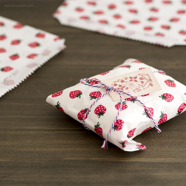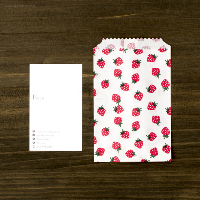 丸々としたおいしそうないちごが散りばめられた紙の平袋。